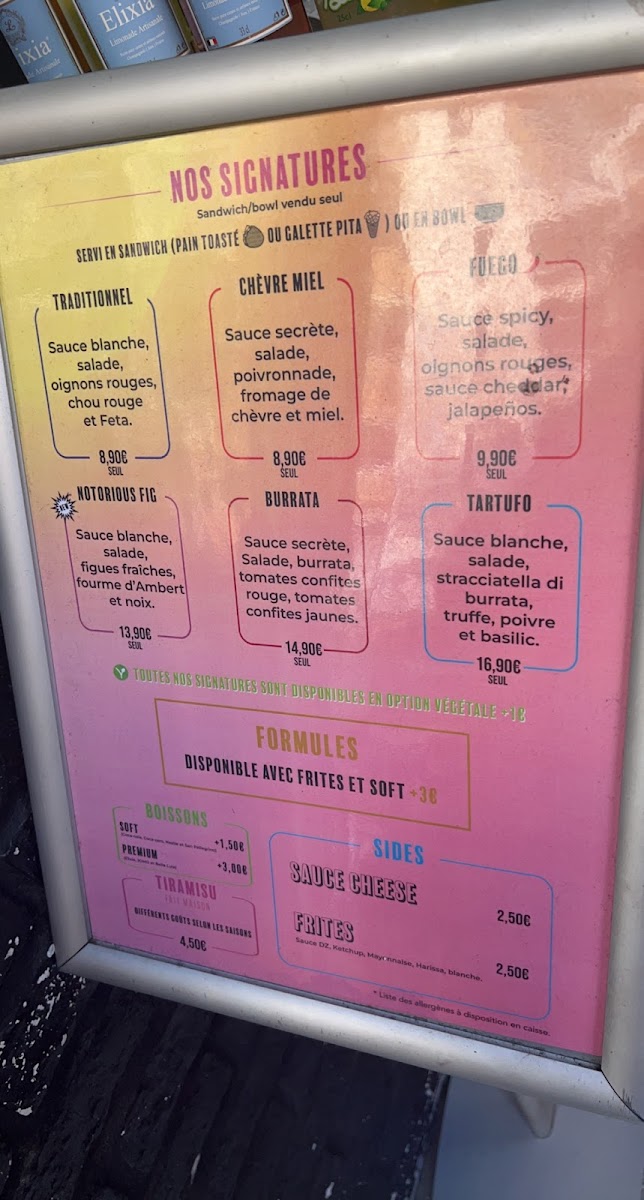 Kebab grillé, sauce secrète, salade, miel, légumes grillés et fromage de chèvre. Le sandwich Chèvre Miel + frites et boisson à 12,90€