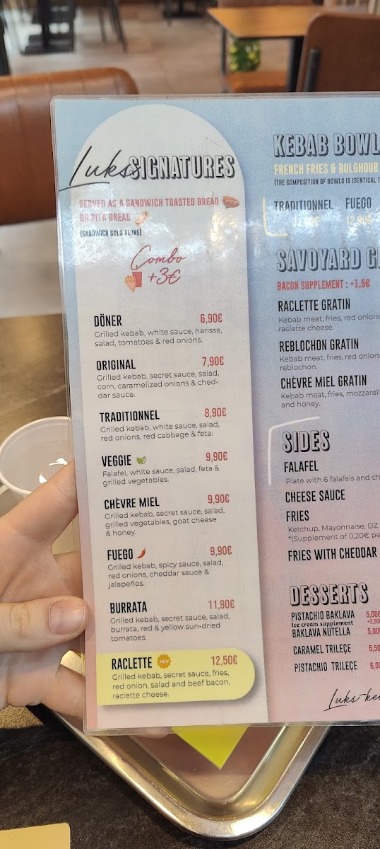 Kebab grillé, sauce secrète, salade, oignons rouges, bacon de bœuf, fromage à raclette et frites. Le sandwich Raclette + frites et boisson à 15,50€